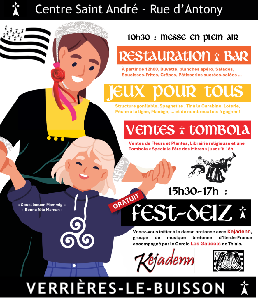 - Ventes & Tombola : découvrez notre stand de fleurs et plantes, la librairie religieuse et participez à la tombola « Spécial Fête des Mères » avec l’aide des commerçants de Verrières-le-Buisson pour de belles surprises jusqu’à 18h.
